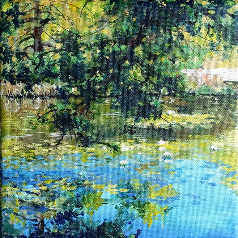 This painting depicts a landscape in the center of which there is a pond with water lilies and a reflection of the surrounding nature on the water. In the foreground, dense tree branches are visible, which partially obscure the view of the pond. The main colors of the painting are green, blue and ye...
