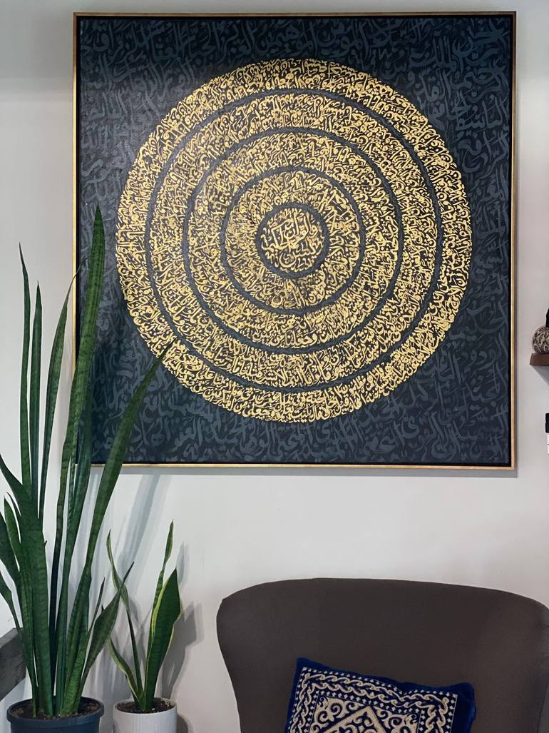Hand-painted masterpiece featuring Surah Yaseen (Chapter 36 of the Quran) with a striking black and gray acrylic background. The intricate calligraphy is rendered in luxurious gold leaf, adding a touch of elegance and sophistication. A beautiful blend of art and spirituality.