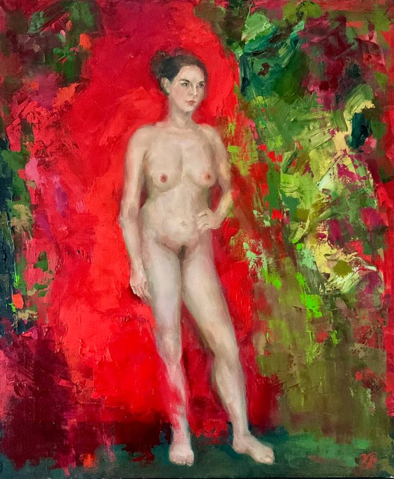 In my creation, I've poured passion into the juxtaposition of vivacious red against the calming green, encapsulating the essence of nature's raw beauty and human emotion. This oil painting beckons the viewer into a dance of color and form, where each stroke tells a tale of vulnerability and strength...