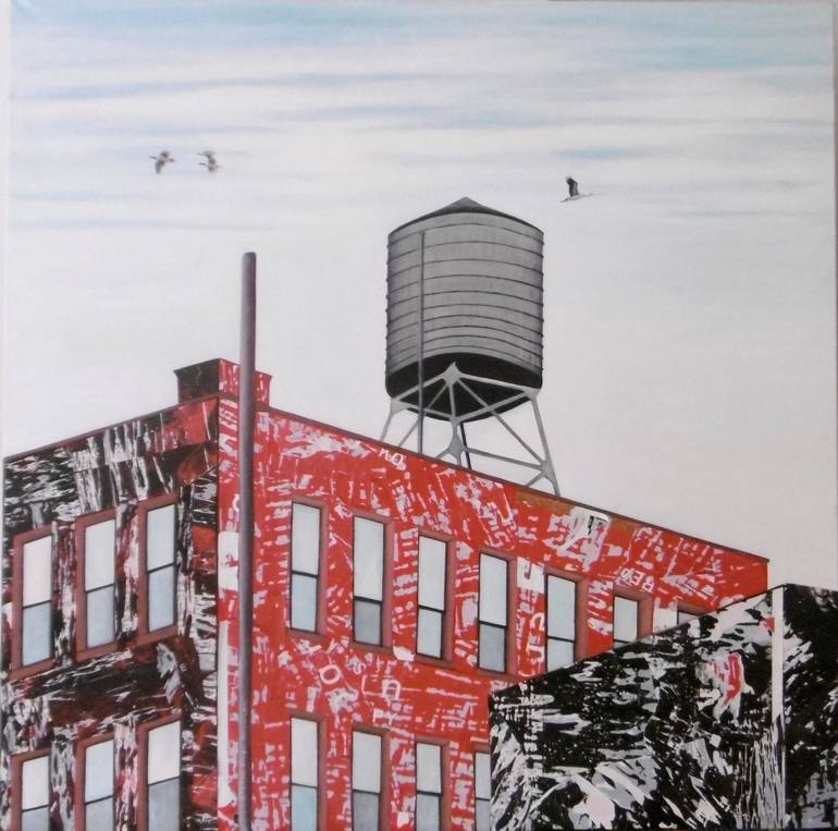 NewYorkCity inspired me...very simple view with water tank i add some paper collage on the building to give it a depth and matiere..some birds too...