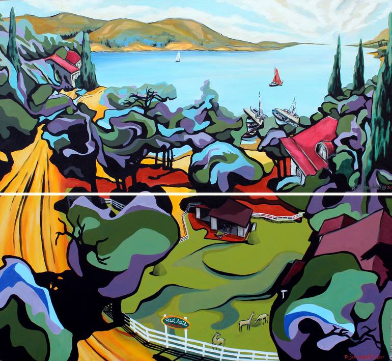 Sunday afternoon on the shore of a lake. Bold shadows begun to frame buildings and trees alongside sandy road leading to the boat docks. Men attending small hobby farm are cleaning stables in the heat of the day and drink beer hiding in the shade. Watching for occasional by passers dominant llama is...