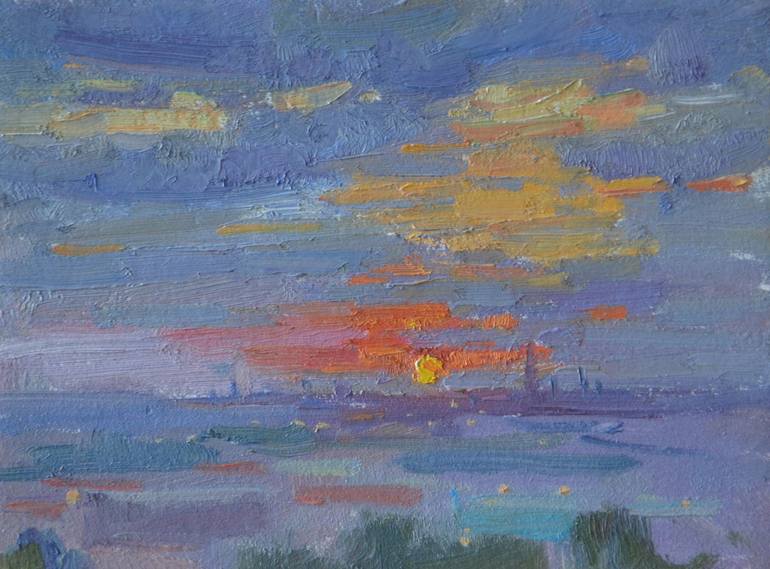The picture was painted from nature. A series of small paintings "Sunset" was created to capture different evening lighting. This painting shows the setting red sun. A small painting is good for a compact space. This painting would look great on windowsill, working desk, shelf, chest of drawers, to...