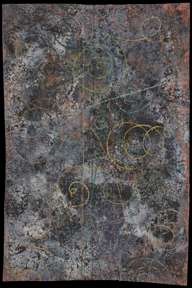 Mixed Media: Spray paint; metallic pigments; nail polish; glitter--seen through distressed, thin, clear panel (PETG). Size is of float-framed work.