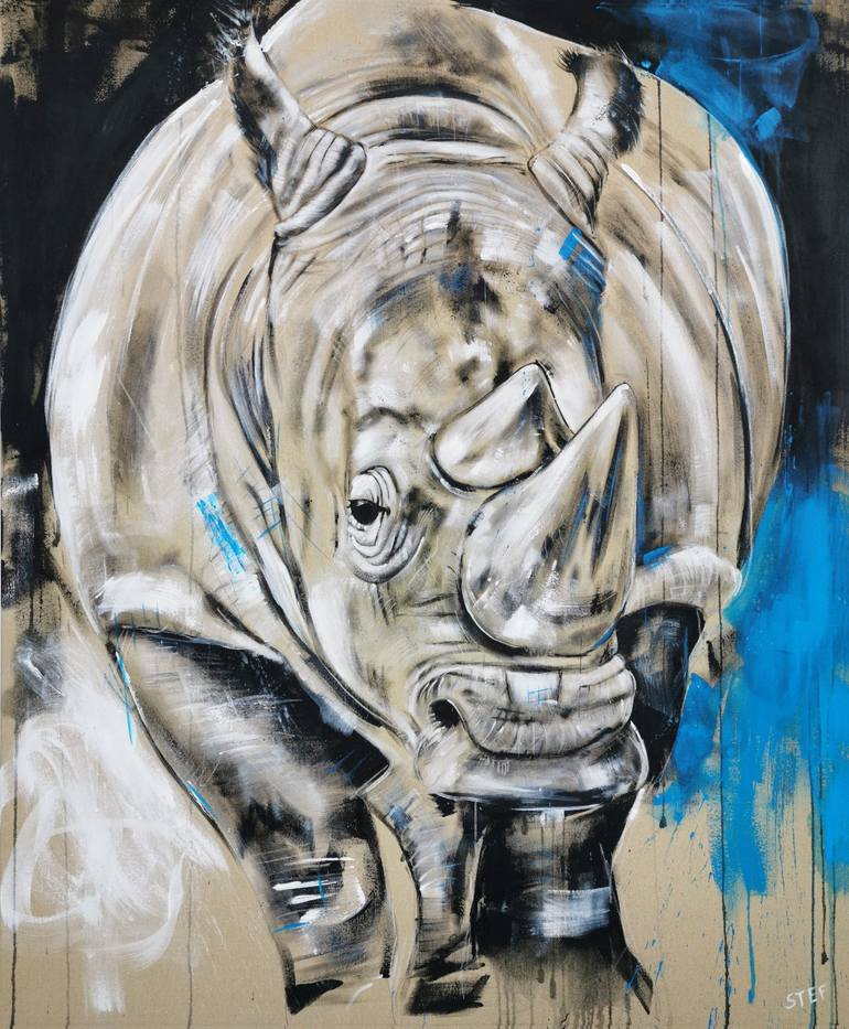 RHINO #4 is an expressive painting of a close up rhino head. Splashing Colors in black, white and blue on raw canvas. The monochrome color in combination with the soft tone of the canvas: 100 x 120 cm „No one in the world needs a rhino horn but a rhino.” This work is created in the series „ONE O...