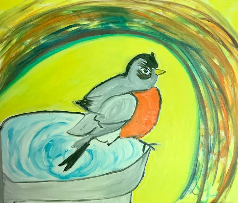 The plump Robin tried out my new bird bath and dipped his tail in. Canvas stretched on wood. The sides are painted yellow like the background.