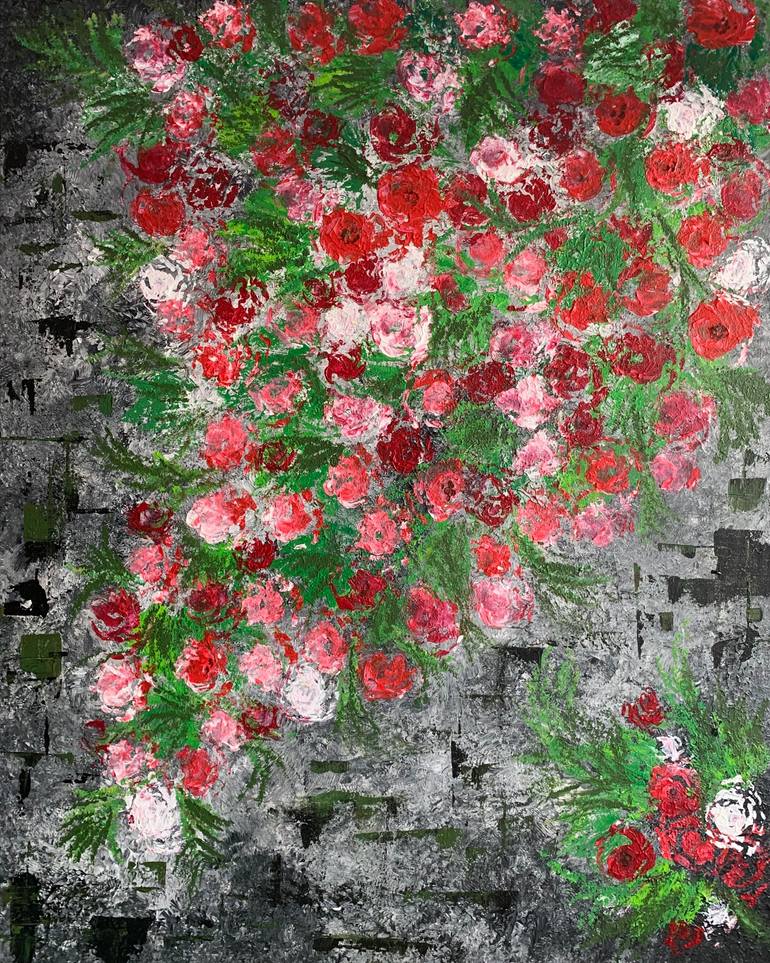 The inspiration to paint this picture were roses. Roses that are not in nature, but roses that contrast against a dark background. This background can be concrete, masonry. Good overcomes evil. Even on dark, cold concrete, beautiful roses can bloom, symbolizing the struggle and defeat of evil. The p...