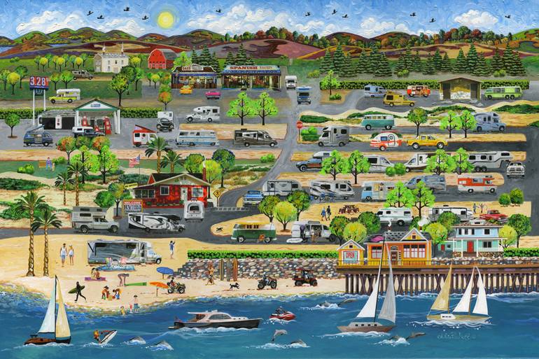 This original painting, "RV Summer Vacation," captures the joy of a summer beach holiday. Recreational vehicles, each unique, are nestled in their spots, their occupants ready to enjoy the sun and sand. Julie's skillful use of both oils and acrylics on canvas brings this folk art scene to life. The...