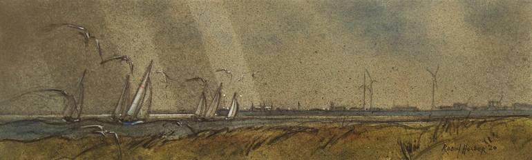 I am always fired up by the view from Portishead towards the industrial horizon formed by Portbury Docks. It changes constantly and I wanted to capture this in my painting, conveying the movement of the weather, yachts and seagulls on this gritty, moody day. Watercolour and pencil on Saunders Waterf...