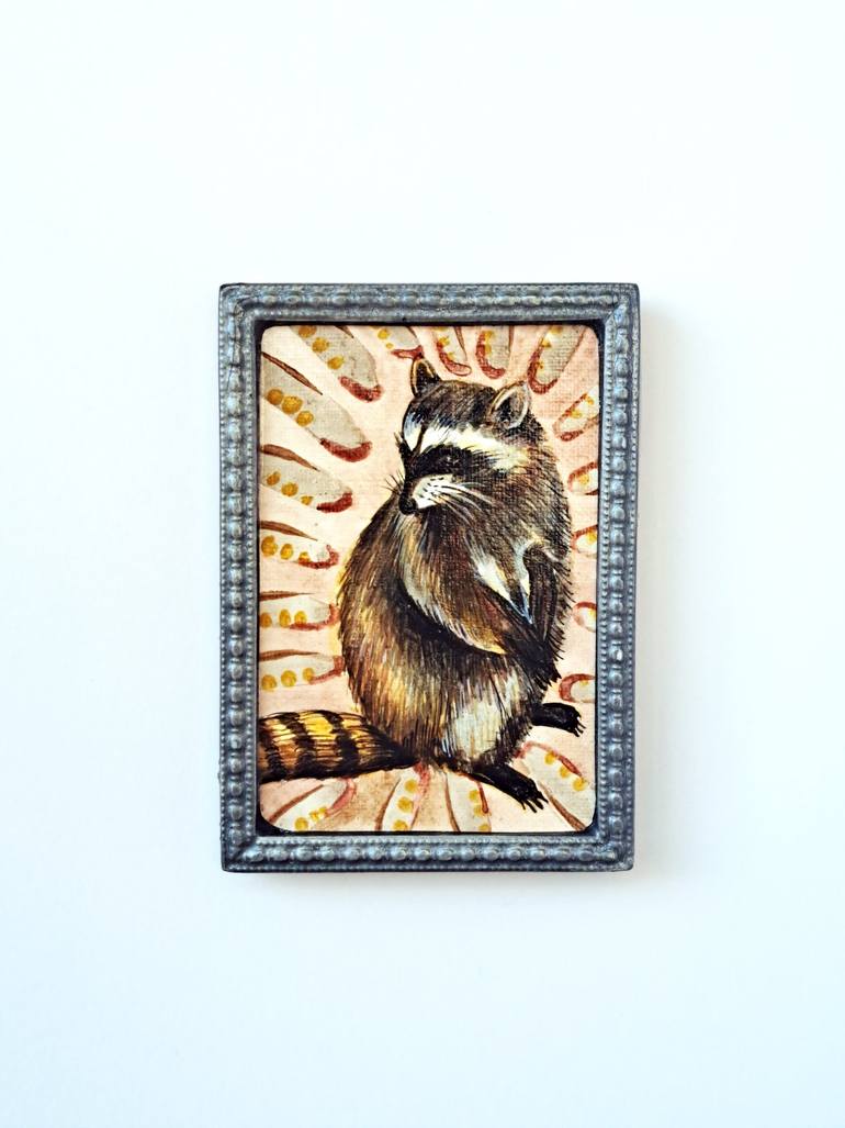 Acrylic painting on canvas, on a painted gesso frame (9x12x1 cm). Miniature painting of a racoon or "procyon lotor". The artwork is packaged, in a handmade box, with the series' logo linocut printed on the packaging, accompanied by signed certificate of authenticity. "Festum animalium" is a series ...