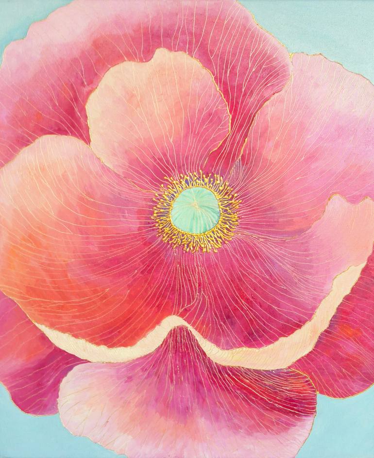 This painting captures the delicate beauty of a blooming flower in mesmerizing hues of pink, coral, and gold. The intricate gold detailing traces the natural veins of the petals, adding an ethereal glow that enhances the painting’s luminous quality. The soft turquoise background provides a serene co...