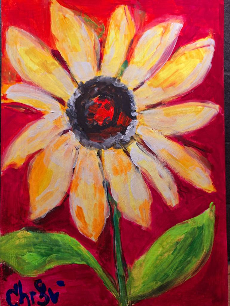 This painting features a bright sunflower in full bloom, painted in bold and vivid acrylic colors. The sunflower’s petals are a blend of yellows, whites, and soft oranges, creating a layered and textured effect. The center of the flower is dark brown with hints of red and orange, adding depth and a ...