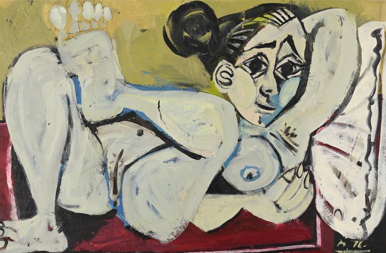 This dynamic oil painting, created in 1976 by Giovanni Battista Marcucci, depicts a reclining nude woman in an abstract and expressive style, influenced by Cubism and Expressionism. The bold brushstrokes and geometric shapes emphasize the raw emotion and distorted reality often seen in the human for...