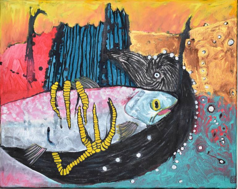 From ancient times, the raven and salmon's presence and imagery are integral to Vancouver Island, on the west coast of Canada, where I live. They are intimately linked to the first peoples' cultures, but also are powerful symbols from my European ancestors as well. I made this painting in response...
