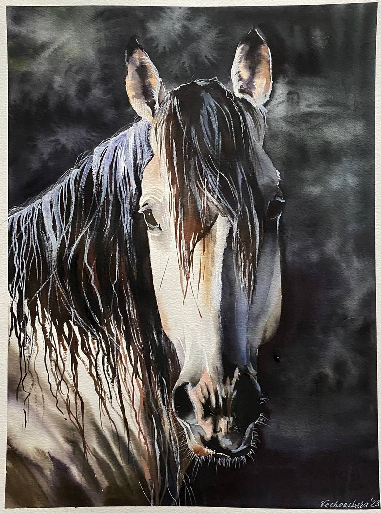 A beautiful white horse. Her name is Rain. She stands illuminated by the sun. Watercolor painting, Prague, 2023.