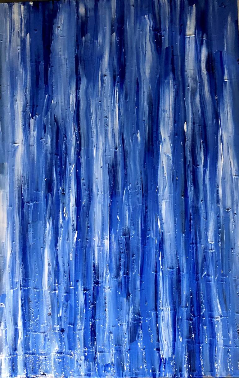 Rain - A 36H x 24W original abstract oil on canvas by Dutch Montana. This is Dutch's interpretation of heavy rain as it hits the windows and flows down the window in sheets. There is substantial texture to the piece which hopefully the close up shots can reveal. This texture brings the rippling wate...