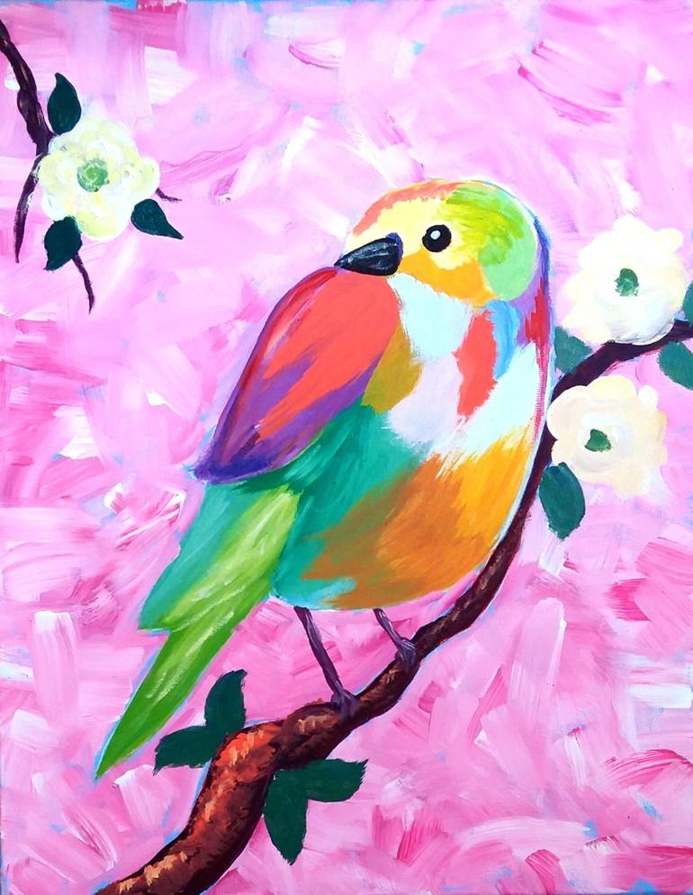This painting was inspired by Ginger Cook's bird hop series with her daughter. Painted with acrylic paint on 16x20 inch canvas with half inch depth. I absolutely loved the color palette for this piece, the vibrant colors work beautifully together while adding to the beauty of the surrealist and abs...