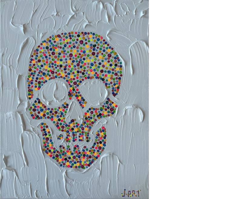 Inspired on the Vanitas with a modern vision, the artist used the brush to make each points and then used thicker paint to bring some texture around the skull.
