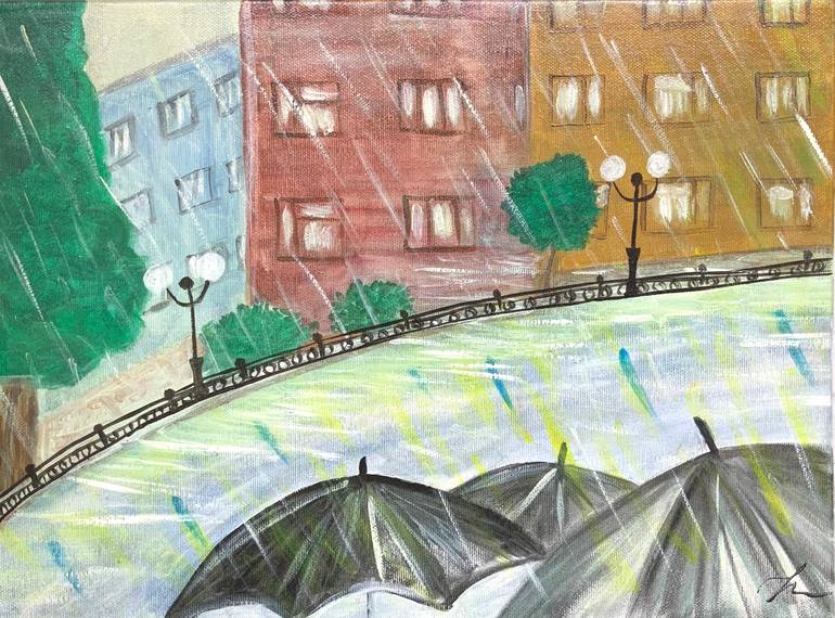 This is an original oil on canvas painting. Multiple-layered, gentle brush strokes. Relaxing atmosphere of a rainy day.This painting survived on June, 24,2025, when our house was ruined as a result of the missile attack.