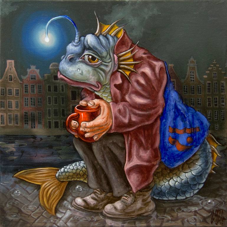 Victor Molev (Canada)"Rainy evening. Sad fish." 2022 30x30cm Oil on Canvas. The work was done on the basis of a drawing (Sad fish) made by the artist during a trip to Amsterdam and provoked by rainy weather.