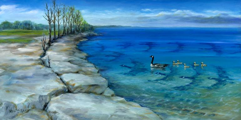 Realistic oil painting of rocky shoreline with Canada Goose family with ghost-like flock of geese in V formation reflected in the water. Bold blues and greens help bring this inspiring image to life while the quiet feeling of the lake gives soothing calm to your decor. The hope/growth/generations th...