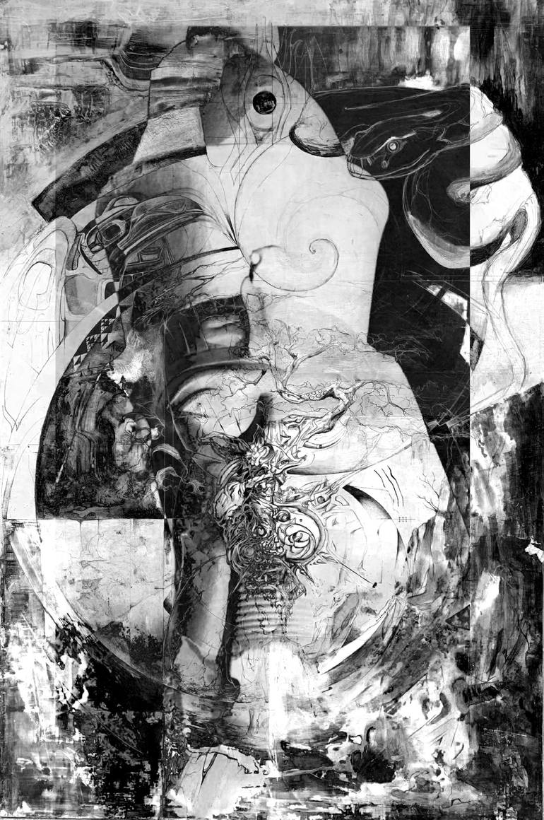 Done as an exploration into the world of paint this piece has set the style of this young artist, with its masterful use of technique and content. It strives to reach and asymmetric balance with itself even amounts of black and white make it feel as though we can see behind the curtain. Ever in moti...