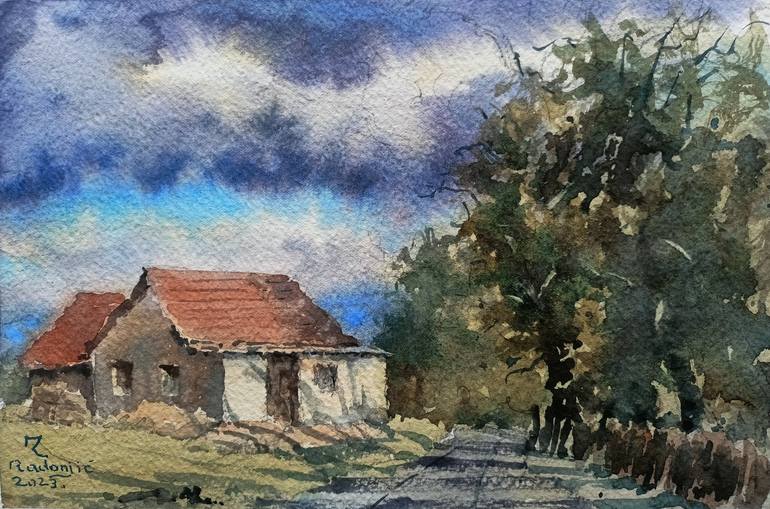 Rasavci, watercolor on paper, 28 x 38 cm, 2023 The landscape was painted in the village ``Rasavci``. The emphasis is on the atmosphere and beauty of the old architecture of this area. The work is done with the traditional watercolor technique, without white paint.