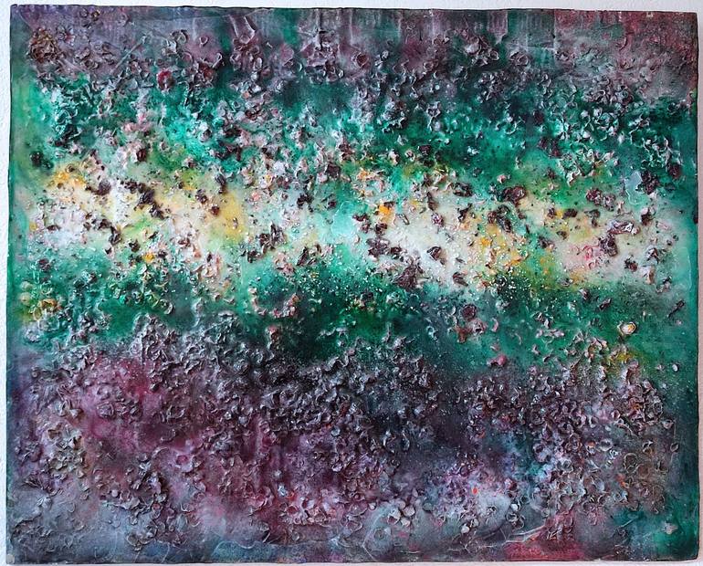 This original abstract painting, "Rayon vert," captures the delicate beauty of nature within a luminous layer of resin. Dried hydrangea flowers and rose petals are suspended alongside pigments and a touch of acrylic. The artist uses this combination of materials to create a work that invites contemp...