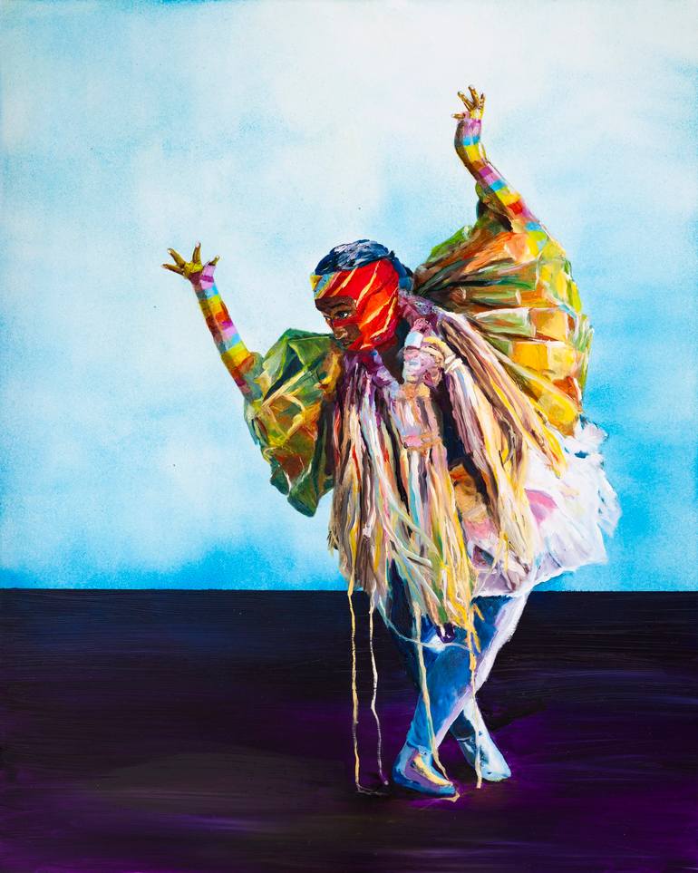 Inspired by a dance ensemble piece of the same name, re:incarnation explores themes of rebirth and transformation through vivid color and dynamic movement. A masked figure stands poised on tiptoe, arms raised in a gesture that suggests both release and renewal. Layers of richly hued fabric and brush...