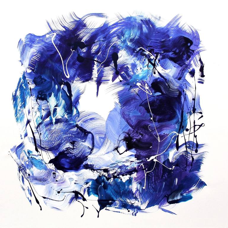 Elevate your senses with "Reach For The Sky," an exquisite abstract painting that is created on a square canvas using acrylic paints, this captivating artwork captures the essence of tranquillity through its deep, serene shades of blue and white against a pristine white background. The painting evo...