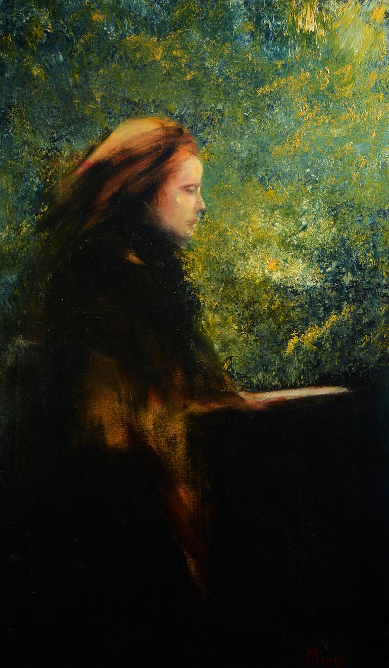 oil painting on canvas Reading In The Garden by Maurice Sapiro captures the stunning profile of young woman reading while immersed in the beauty of the surrounding garden. This piece features a palette of natural green tones. Award-winning artist Maurice Sapiro captures the beauty of Nature throu...