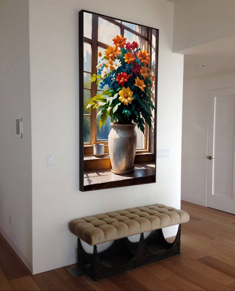 Beautiful still life painting of realistic flowers and pot near window. This artwork is made using oil on artist great Canvas with great textures. Highly recommend for living room and entry way wall. Customization possible for this painting if required in different sizes please contact