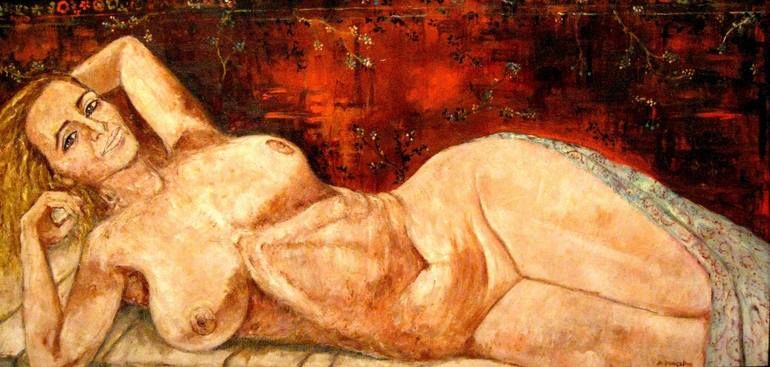 oil on canvas 140x70x0.5 nude model reclining on a sofa vith a little blue cover