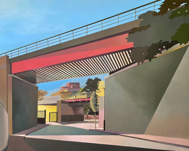 Marie Lenclos is a Paris born painter living and working in South-London since 1995. Lenclos is developing a recognised body of work based on the observation of urban landscapes and buildings close to her home and studio in South London. Lenclos was a documentary video maker for around 12 years. This made her very conscious of the way she looked at the city around her. She got used to 'framing' things all the time, even without a camera. Walking around she would suddenly see something and think: 'this would make a good shot'. Since becoming a painter, she sees something and thinks: 'there is a painting in this'. Her paintings capture a 'moment of seeing', when lines, light, colours and shapes all fall into a particular order that suddenly makes sense to her. Reality is simplified, and perspectives become her own. Her main focus is colour, which she aims to make vibrant and emotional through gradients and the use of light.