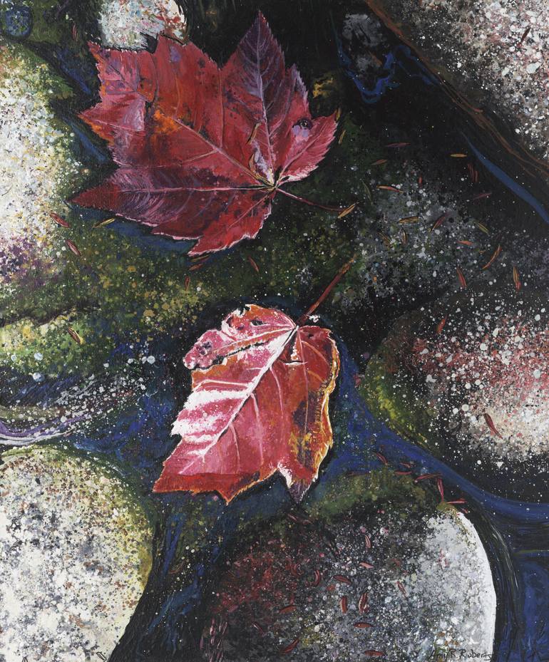 Hiking in New Hampshire in the fall is a candystore of color. Wood strip frame stained Mahogany built by the artist.