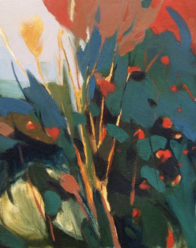 From the series 'Hedges and Tangles'. Dried stalks, flashed with golden colour from the setting sun, rose hips spark of blood red, chill in the air, autumn is coming. Painted in oil on canvas, mounted on 6 millimetre birch plywood. The painting can be displayed framed or unframed.
