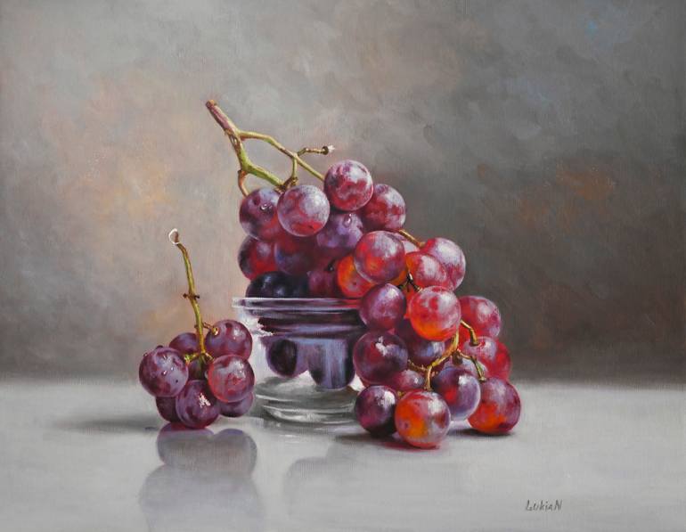 This artwork is based on my original oil painting, created from life. A realistic still life featuring ripe red grapes arranged around a small glass jar. The painting explores the play of light on translucent surfaces, the weight and freshness of the fruit, and the quiet harmony of everyday objects....
