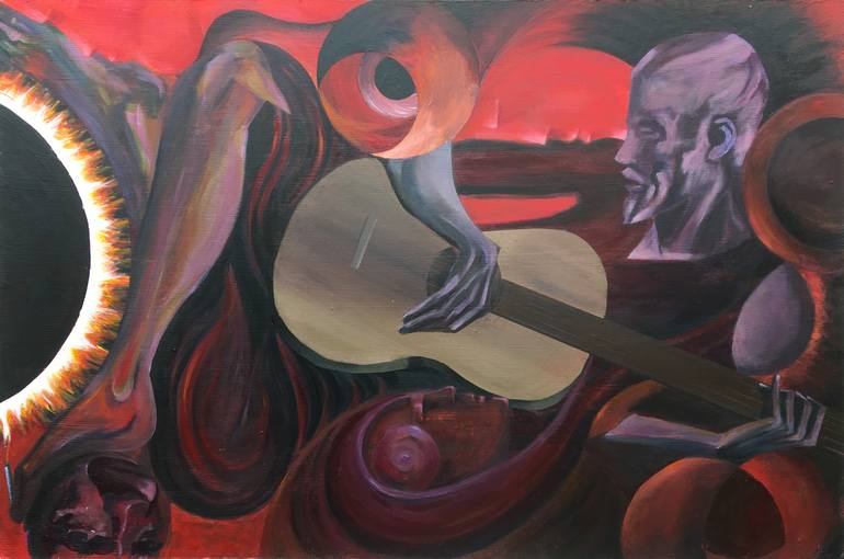 This work was inspired by Picasso's "Blue Period" I decided to paint this in various shades of red to reflect my current personal mindset and status. Again, inspired by Picasso's use of negative space, I have intertwined all the objects within the painting to connect with each of it's adjacents. Ev...