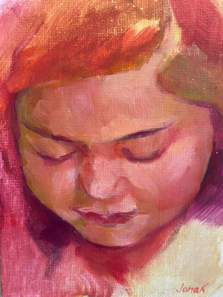 This is an original artwork, a portrait of a little girl, rendered in warm pink and purple hues.