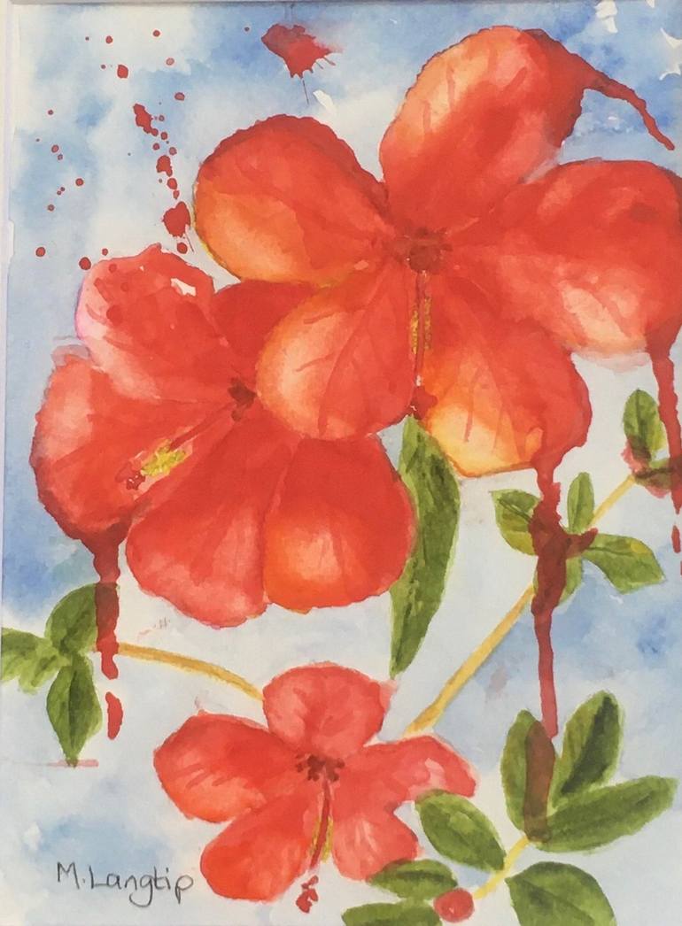 A loose painting of a tropical red Hyacinth. My travels to Queensland inspired me to paint this brilliant flower. My style in watercolour is loose and relaxed. This would brighten any spot on your wall. It is framed behind matt board and cellophane.
