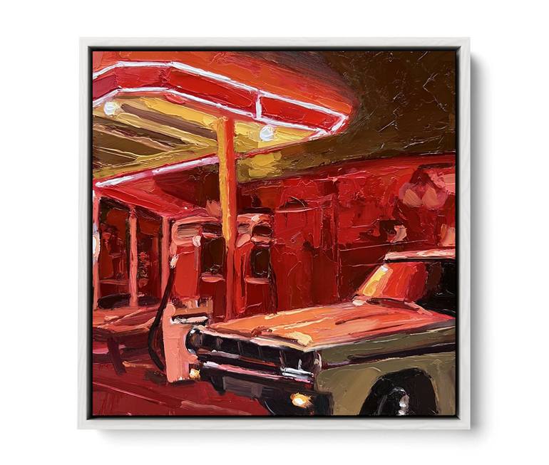 Red Light District is an original 8in x 8in palette knife oil painting on a cradled wood panel. This heavily textured impast painting is made with premium oil paint and applied with palette knives and brushes for an emphasis on movement and fluidity.