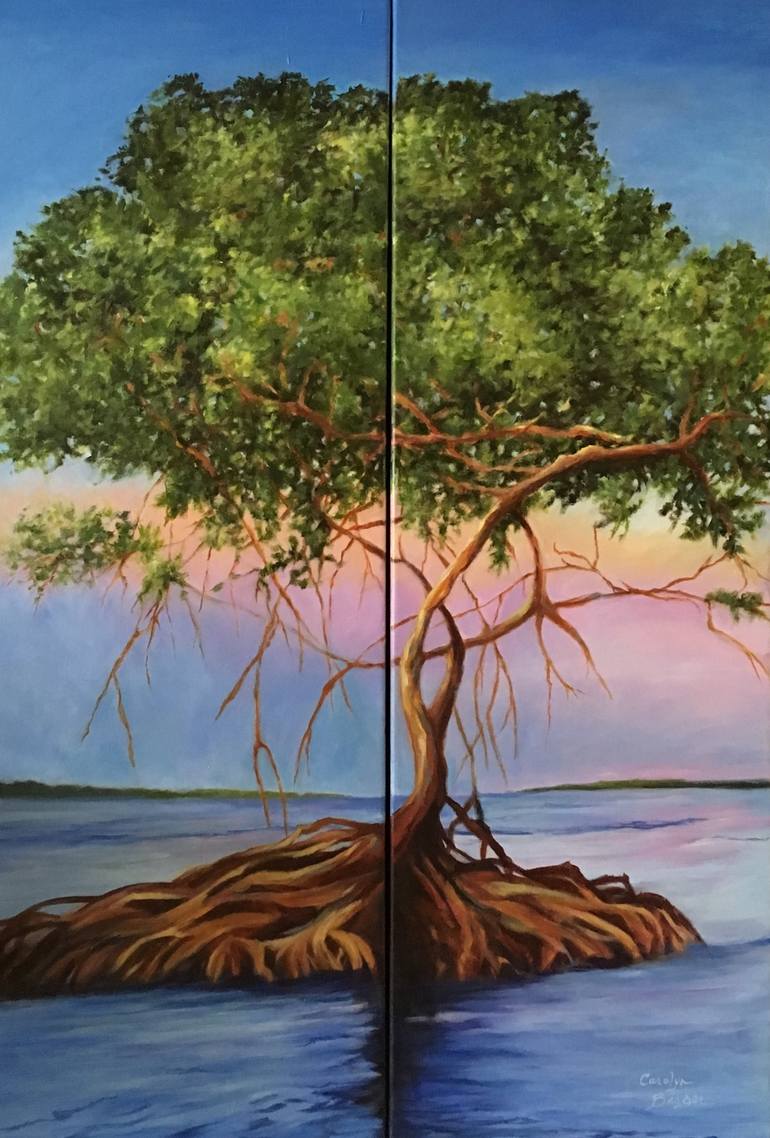 Mangroves surround the island I live on, Marco Island, FL. They grow in the salt water, and provide nesting space for the wildlife and protect the island when storms and hurricanes strike. Mangrove trees are know for their unusual root system which are shown in this painting. This is a red mangro...