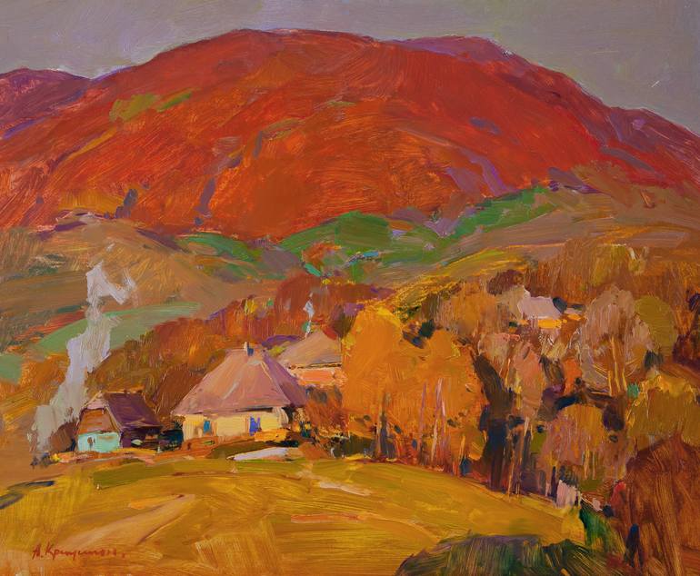 Autumn evening in a mountain village. Beech forests give mountains a bright red color ARTIST: Aleksandr Kryushyn WORK: Original oil Painting, Handmade artwork, One of a Kind MEDIUM: oil on panel YEAR: 2018 TITLE: "Red Mountains" DIMENSIONS: 49.5 х 49.5 х 0.3 cm. / 19,3" x 23,2" in. Unframed. The pi...