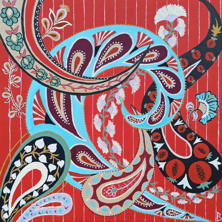 I have a background as a fashion designer - hence the interest for beautiful, colorful fabrics. This painting is inspired by a scrap of cotton with a lovely paisley pattern found in the bazar of Istanbul. The paisley patterns have been loved from India and Persia to Central Asia. They were also copi...