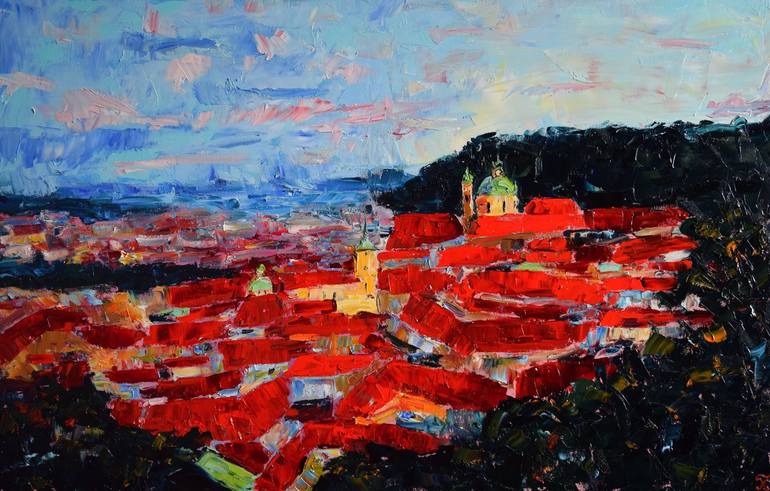 Large original oil painting on canvas with red roofs of Prague, Czech Republic. Not a print. This painting is original, authentic, one-of-a-kind, 100% hand painted. Created using oil colors on canvas. Free brush and palette knife work, impressionist impasto style. Colors are bright and positive. I...