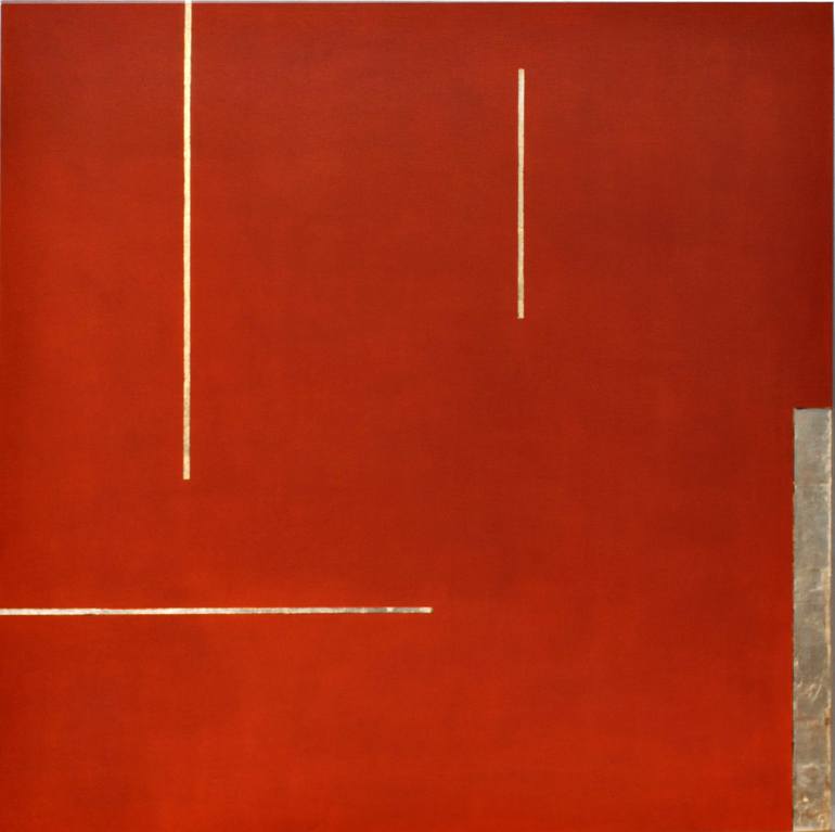 Red Silver Square painting of radiating red color with silver leafed lines accenting the reflecting light has deeply meditative quality.