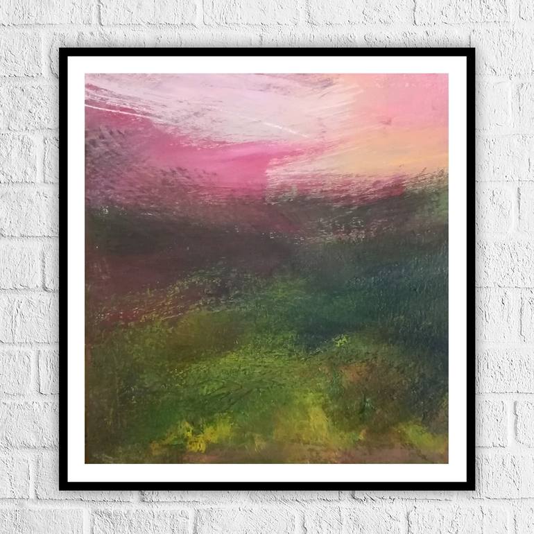 Over the Brecon beacons national park there are some amazing sunsets.This small acrylic landscape painting is inspired by the beautiful pinks and red colours that dominate the skies above the valleys. This 4 X 4 inch miniature is painted onto gesso card a surface I love to use. It's varnished to pr...