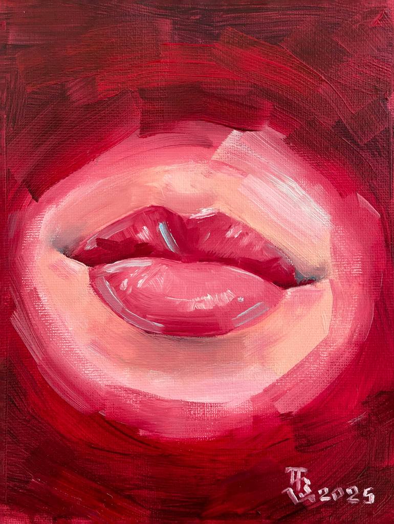 Oil painting “Red Water”. Such paintings are a surge of emotions for me, I like that I create them without preparation or a long search for references. This painting is pure energy, a sudden emotion that I splashed out on the canvas. Miniature in the style of expressionism with female lips on a red ...
