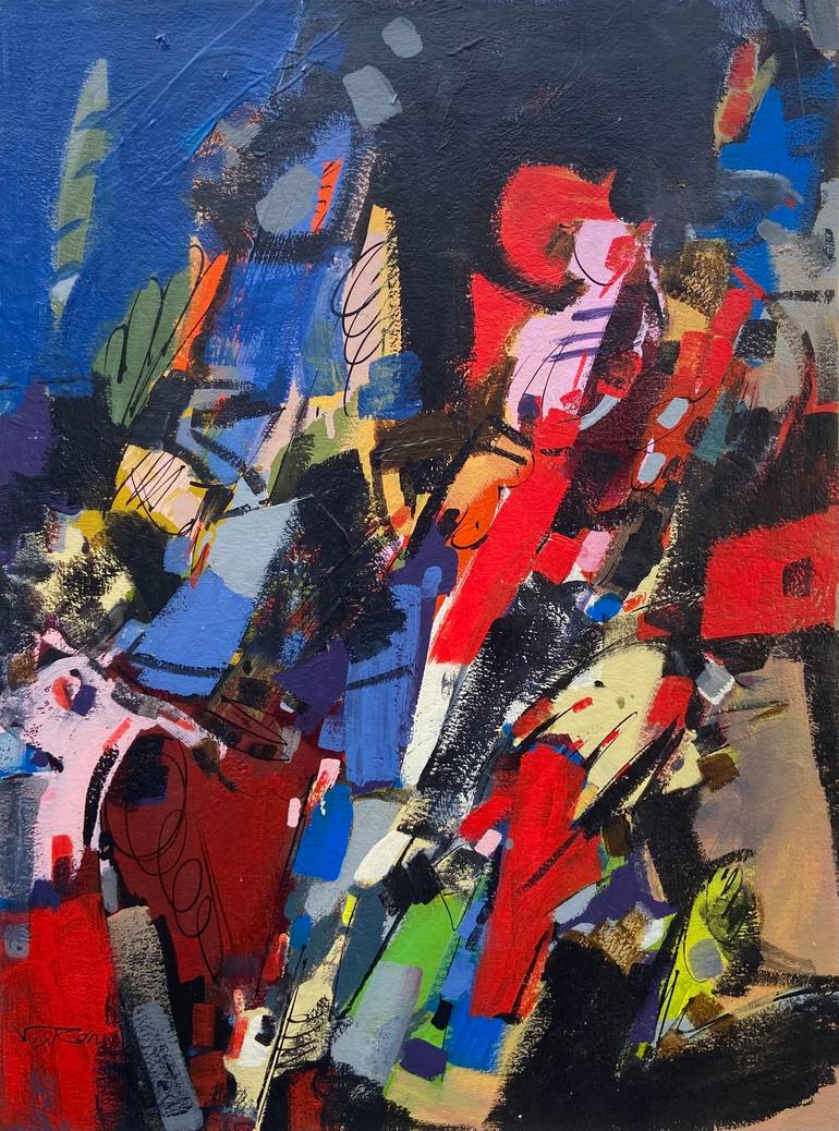 Acrylic on canvas, worm colors, blue, red , black, Matt varnish finished.