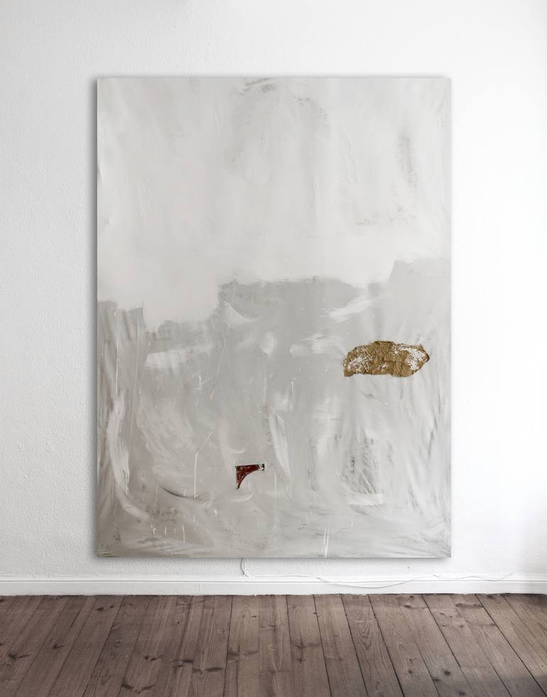 All my work and my creative process is based on three key elements or ideas: the exploration of the subconscious, improvisation, and serendipity. My painting originates in the subconscious. I start from the absence of any idea to come to the idea. The result is something unexpected for myself that through painting comes to light. It is a game in which I find myself and I am myself shocked at the same time. Improvisation is also an important component in my work. I am a musician, and jazz music in particular is essential in my life and in my work. In a way the character of this music is reflected in my work. There is improvisation in the choice of fabrics and in the execution itself, using whatever happens to be in my studio: available colors, pieces of paper that I find on the ground, rolls of tape or pieces of wood, cardboard or paper. All these elements harmoniously compounded give rise to the composition of the canvas. The universe is in the end the result of coincidence and similar to nature, serendepity is fundamental in my creative process. Searching making discoveries by accidents and sagacity, manipulating chance to control the outcome, in the absence of any specific project, but continuously transforming the work in search of beauty. And beauty may be in something old, broken, dirty, in the chipped and cracked walls of a facade, the ruins of a building or in the cracked roles of billboards. But also in a simple line, in an apparently sloppy figure, on a piece of adhesive tape, a rayon, a doodle or in an illegible text. My work in the studio is very physical. I always paint on the canvas with no frame, sometimes extendng it directly on the floor. The fabric tends to fold, gets wrinkled and paints itself. The fabric makes the work, and gives rise to works depicting the tension and confrontation that occurs when they hit the subconscious, improvisation and serendepity. They embody the combination of these three forces, but always controlled and manipulated by the skill and intuition of the painter (sagacity), who becomes the catalyst or active agent of a creative process understood as a game whose outcome becomes interesting for the painter, as so unexpected.