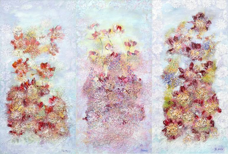 I started this triptych from "Happiness is always in your heart" series in 2008. 9 years ago I decided to change some details of my paintings, because age changed my sense of reality. Previously, the picture was bright, as impressions of youth. Now the fog has filled the abstract landscape, this is ...